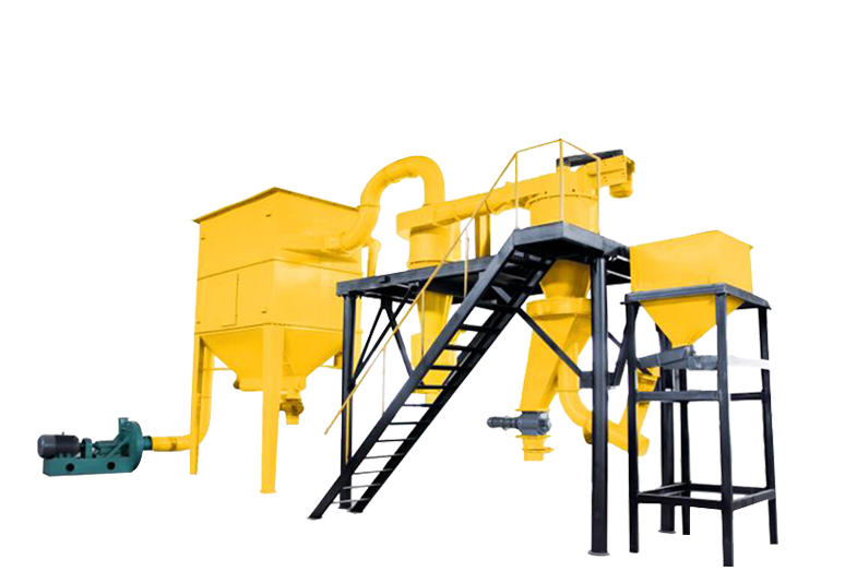 整套分級(jí)裝置由氣流分級(jí)機(jī)、旋風(fēng)收集器、脈沖除塵器、高壓引風(fēng)機(jī)、電控柜等組成。氣流分級(jí)機(jī)是帶有二次進(jìn)風(fēng)及立式安裝的大葉輪轉(zhuǎn)子的強(qiáng)制型分級(jí)機(jī)。